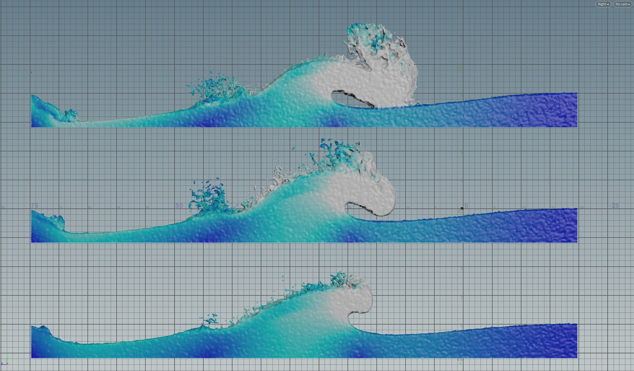 Este simulador base se utilizó para tres capas renderizadas: mallada con superficie de fluido de partículas y sombreada con un material de agua, rasterizada en un volumen y renderizada con un sombreador de volumen, y representada directamente como puntos opacos para pequeñas gotas separadas. Por último, utilizando estos puntos como fuente, se ejecutó un sim Pyro para modelar partículas spindrift muy ligeras, también representadas como puntos de subpíxeles opacos. La geometría de la superficie del cuerpo se rehace a una resolución que apoyaría el movimiento hidrodinámico, y las ondas añadidas a través del ruido en capas y/o un Solver de ondulación que podría reaccionar al movimiento del cuerpo o colisionar con objetos que se intersecan.