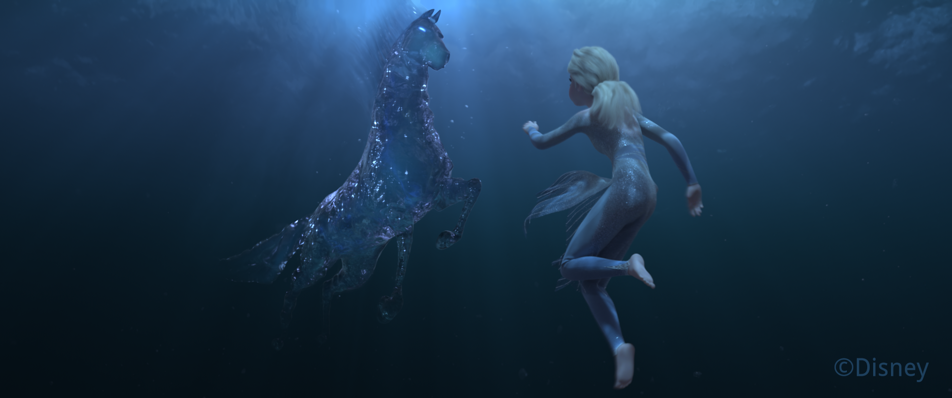 Una de las secuencias técnicamente más desafiantes de Frozen 2 ve a Elsa correr a través de una superficie del océano tormentosa, encontrando y a veces siendo velatoria por, olas que son hasta cinco veces su altura. Esta secuencia requería ondas de cierta altura y frecuencia y utilizaba una combinación de superficies de simulación y de procedimiento oceánicos.
