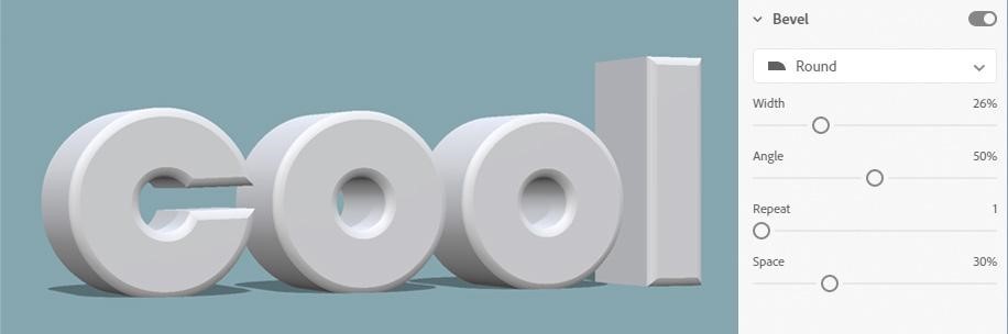 Los usuarios pueden extruir texto a una profundidad personalizada, o aplicar uno de los siete estilos de bisel preestablecidos, es posible ajustar parámetros básicos, como el ancho y el ángulo del bisel, pero no hay curva de perfil de bisel.