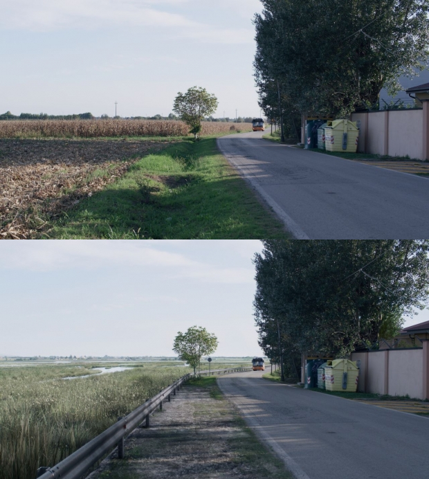 La mayoría de las tomas de efectos visuales trataban con el entorno de la base y las marismas circundantes del Véneto. La ampliación del conjunto limitado de edificios en el lugar requería el uso de la arquitectura CG, carreteras, mobiliario urbano, árboles y plantas. Guadagnino, que es increíblemente detallista en cuanto a los matices del diseño urbano, sólo firmó las extensiones cuando los planos de la calle tenían lo que él llamaba movimiento arquitectónico, el sentido de un espacio vivido.