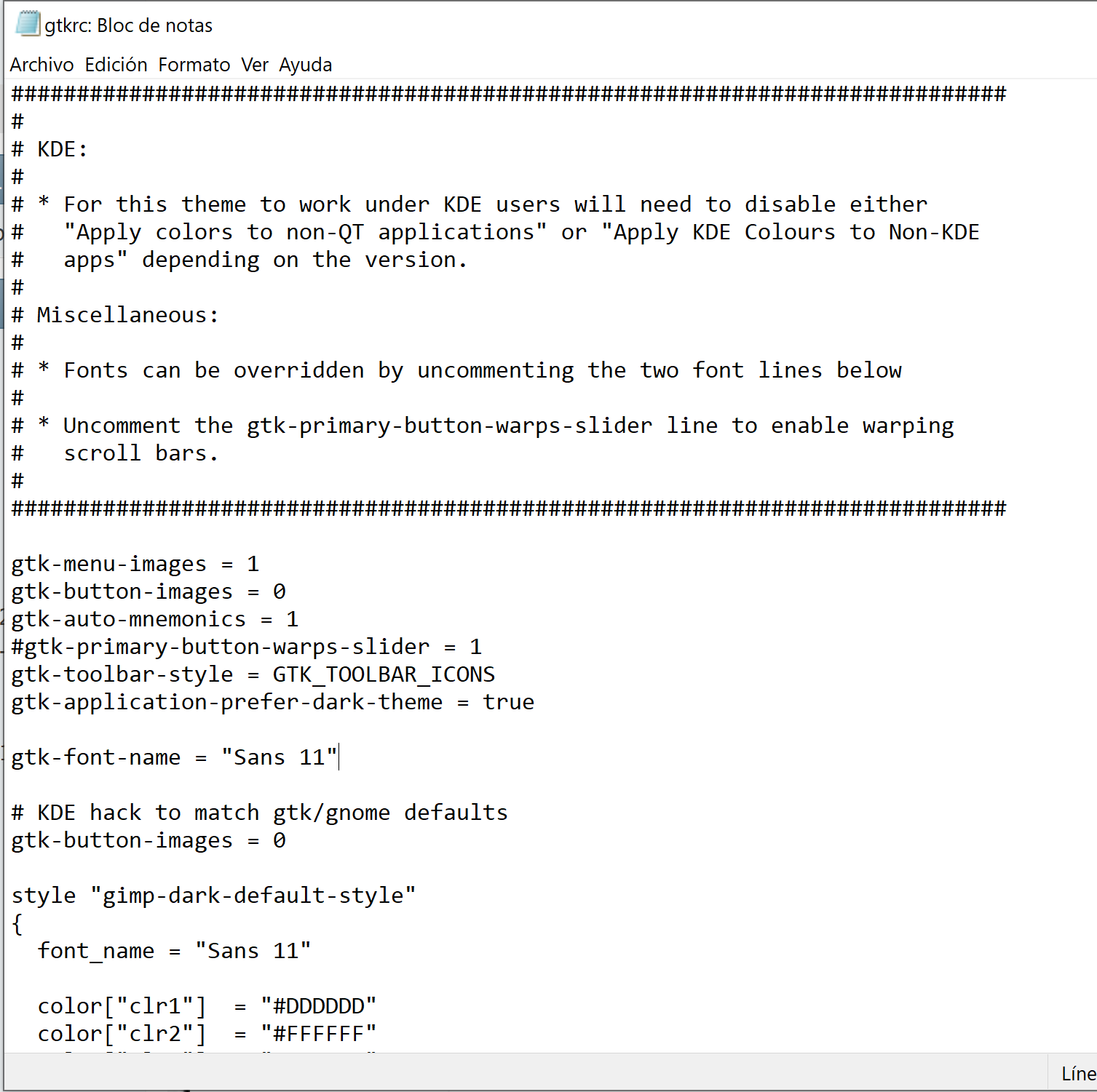 Es decir, el único cambio es descomentar, quitarle el #, para activar el valor de 11 en el tamaño de la fuente, luego si no te gusta con editar y cambiar el valor es suficiente, para ver los cambios sin tener que reiniciar Gimp, basta con cambiar de un theme a otro en el menú Editar/preferencias/ interfaz/tema.