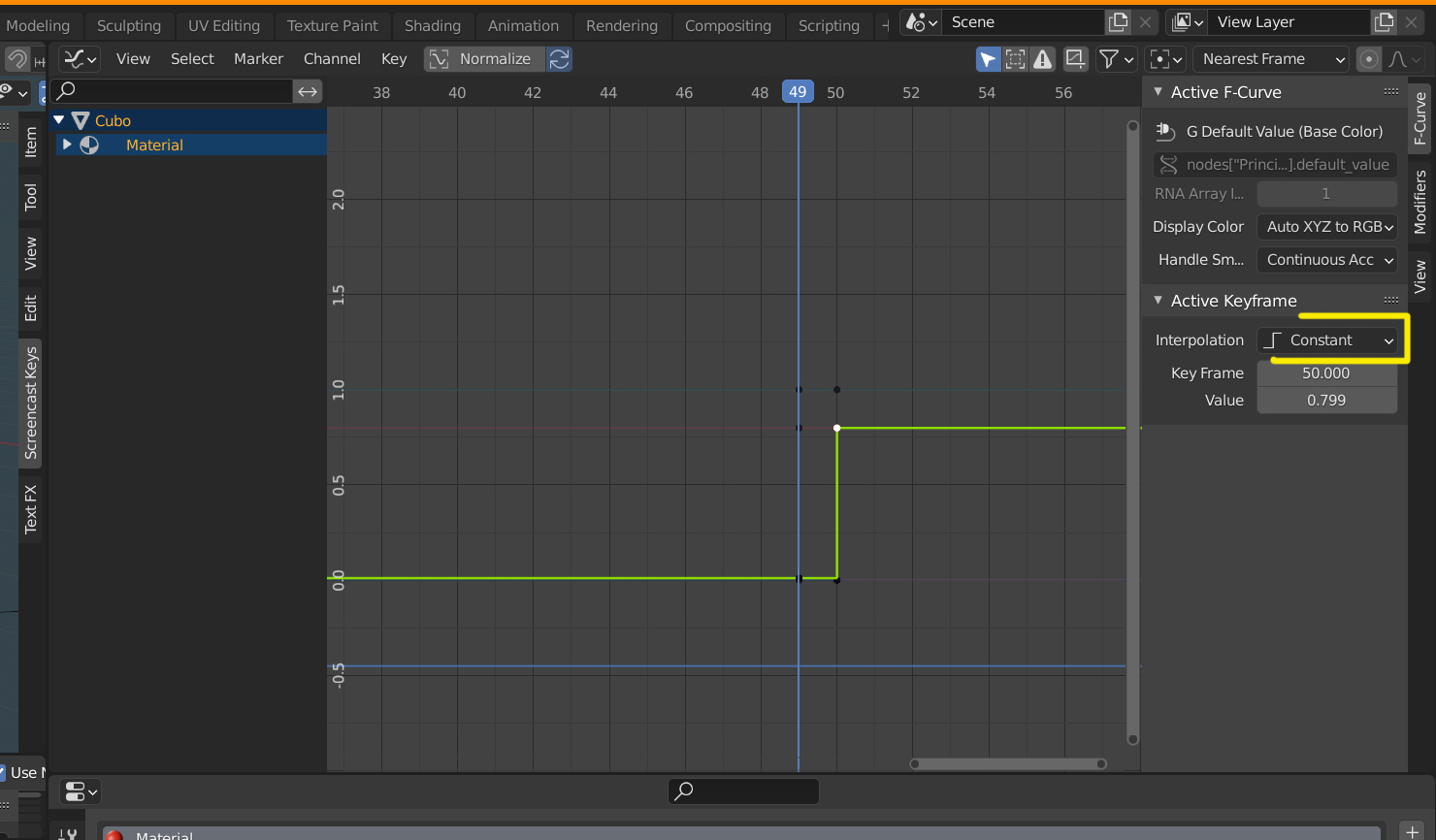 Pues marcas en el frame 1 y en el 49 el mismo color y luego cambias al 50 cambias el color y vuelves a presionar I.