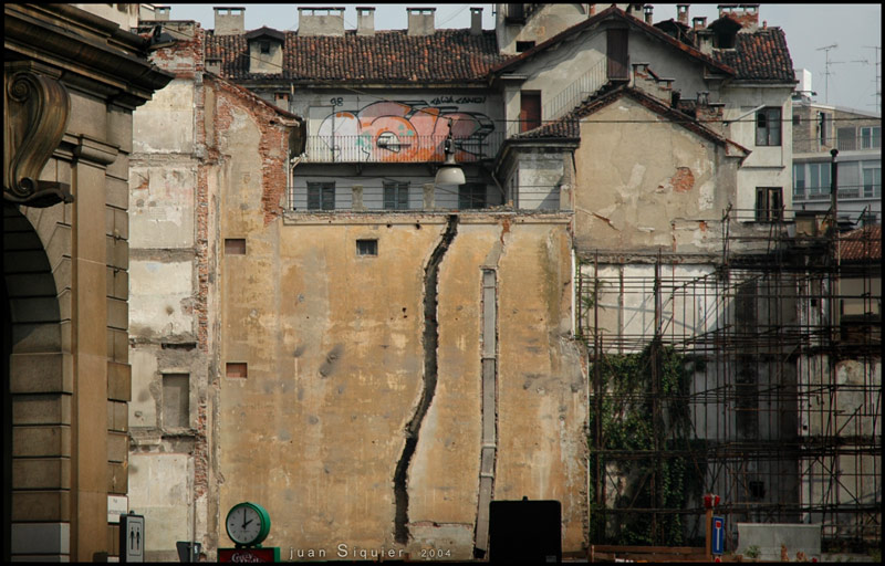 La que más me gusta es la segunda fotografía, siempre he pensado que los cables de tranvía dan mucho juego. En la primera fotografía me ha dejado un poco acojonado semejante grieta, yo la verdad es que no me acercaría demasiado, estos italianos como tienen todo de abandonado. De cualquier forma veo esta fotografía un poco plana y con esa grieta demasiado centrada. Yo me hubiera apoyado en la arcada esa de la izquierda, la hubiera metido más en toma dando más profundidad a la fotografía.