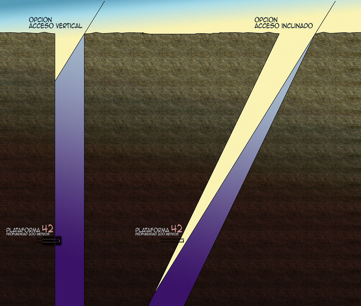 Desde una profundidad de 200 m, no veríamos el sol en ningún momento, tal y cómo se ve en el dibujo. Esa es la máxima inclinación solar, nunca tendremos el sol vertical si Deep City está por encima de los trópicos. Para ver el sol, tendríamos que tener unos accesos inclinados.