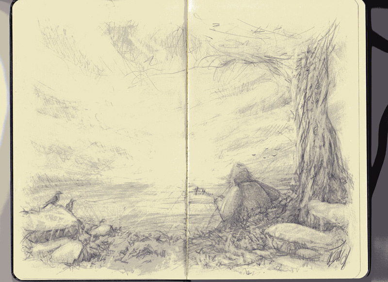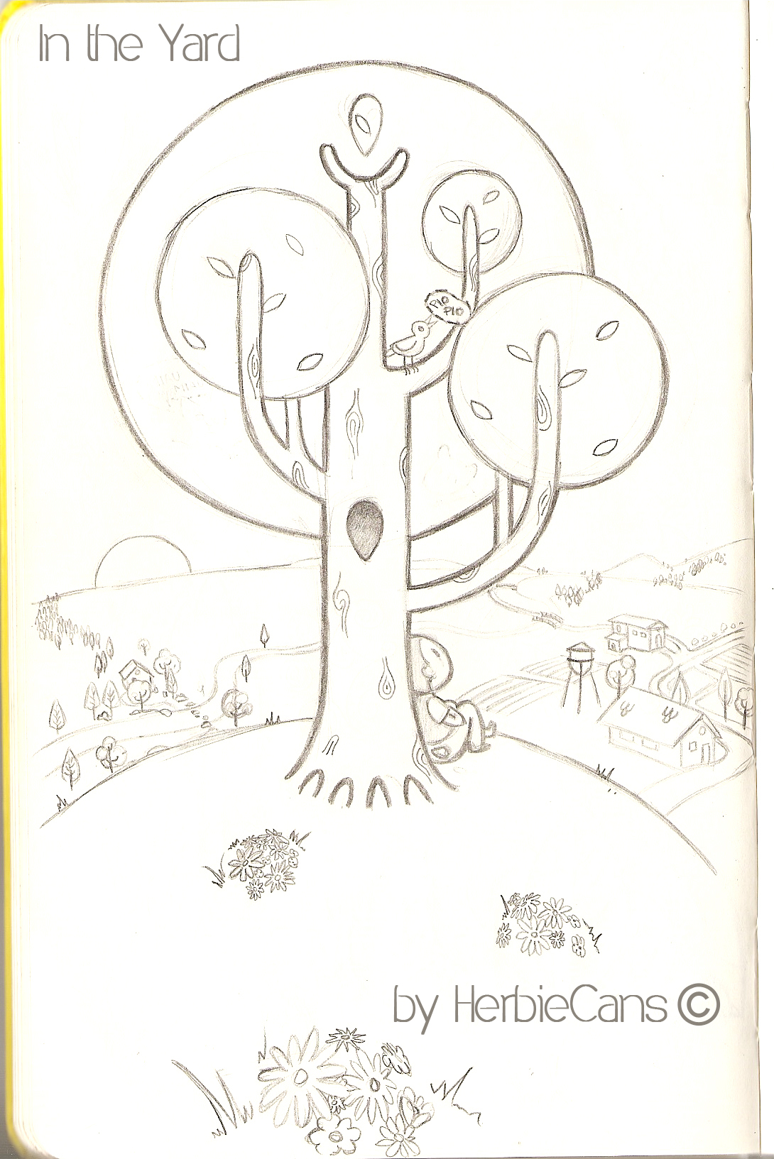 Ya puestos, aquí les cuelgo uno de los últimos bocetos que he hecho y en el que ando trabajando el color. In the yard y otros bocetos sí, sí, en la moleskine esta.