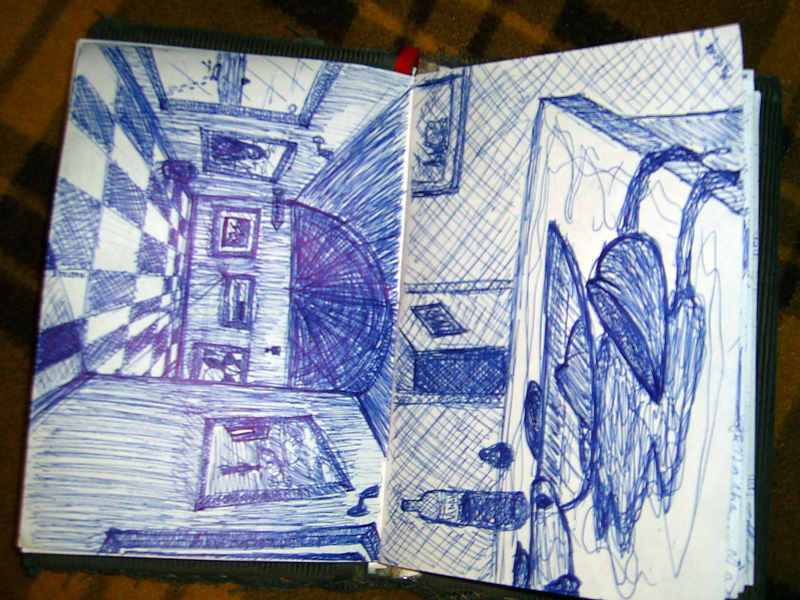 Recuerdo que uno de los dibujos era de una cucaracha que se instaló en el baño (estuvimos un tiempo sin agua ) y a la que llamamos (mis compañeras y yo) Marta y a la cual intentamos asesinar con ambientador. En el dibujo salía la cucaracha bañándose en el spray que le echamos.