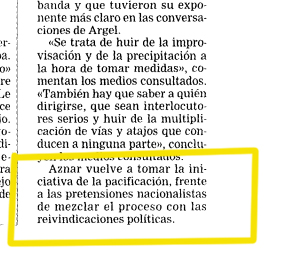 Para los que solo piden la cabeza de Zapatero en el tema de eta, que también pidan la de Aznar, unos titulares, tirando de hemeroteca.aquí la noticia .El portavoz del gobierno, Josep piqué, aclaró ayer que la voluntad del ejecutivo es mantener contactos directos con eta. Si se trata de contrastar la voluntad de diálogo de eta, habrá que hacerlo directamente con la organización armada.aquí la noticia .El presidente del gobierno, José María Aznar, manifestó ayer que está dispuesto al perdón y la generosidad si eta acepta el resultado de las elecciones vascas y renuncia definitivamente a las armas.