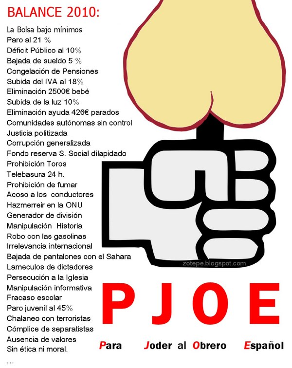 Hoy, por ejemplo, y corregidme si me equivoco Zapatero establece un techo de gasto para las autonomías y nos rebajan la calificación de la deuda, y pagamos menos de intereses parece que la cosa mejora pero más dice que no, que el montilla le ha dejado un pufo y que no, y va a ver a Zapatero zp le dice: tú sí puedes endeudarte los demás dicen que por que ellos no Zapatero dice que vale, que sí, que pueden endeudarse y la agencia de calificación ésa (sí modys, los malos de la película) dice hoy que va a bajar de nuevo la calificación si las autonomías se endeudan con lo que pagaremos más de intereses, aumentaremos nuestra deuda, nos exigirán reformas, nos bajaremos los pantalones y más retroceso social lo digo sin complejos.