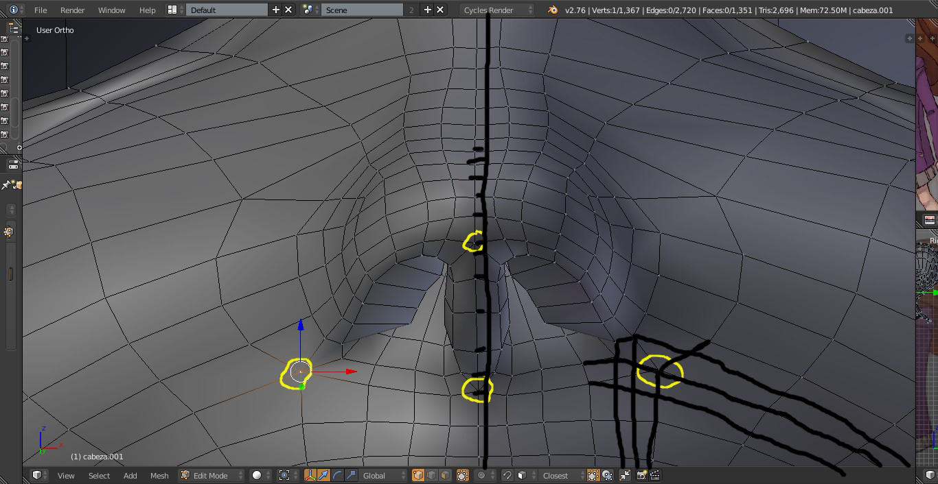 Posdata: me acabo de dar cuenta que lo del merge en los vértices de los bigotes es una tontería (quedaría igual que si se movieran esos vértices sin más). Habría que eliminar el loop que hace circunferencia alrededor de la nariz (el que pasa por esos vértices) para que realmente quedarán sólo 4 aristas.