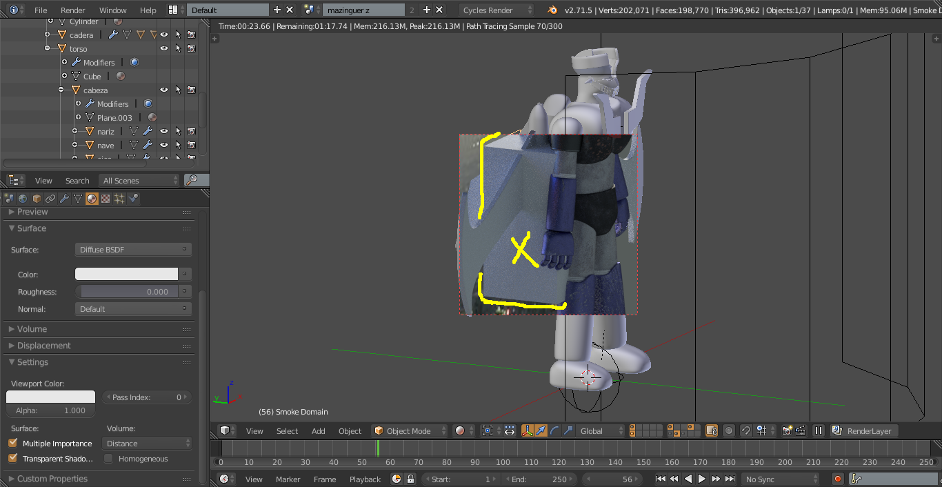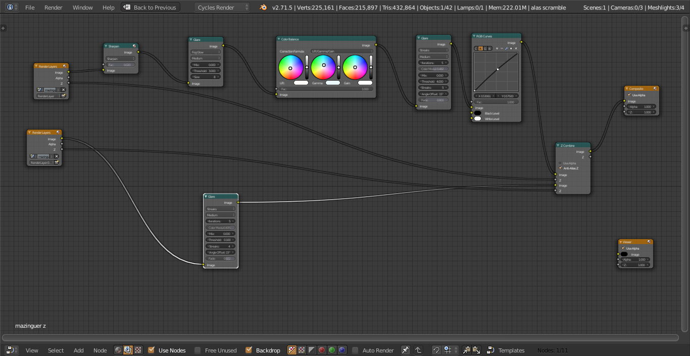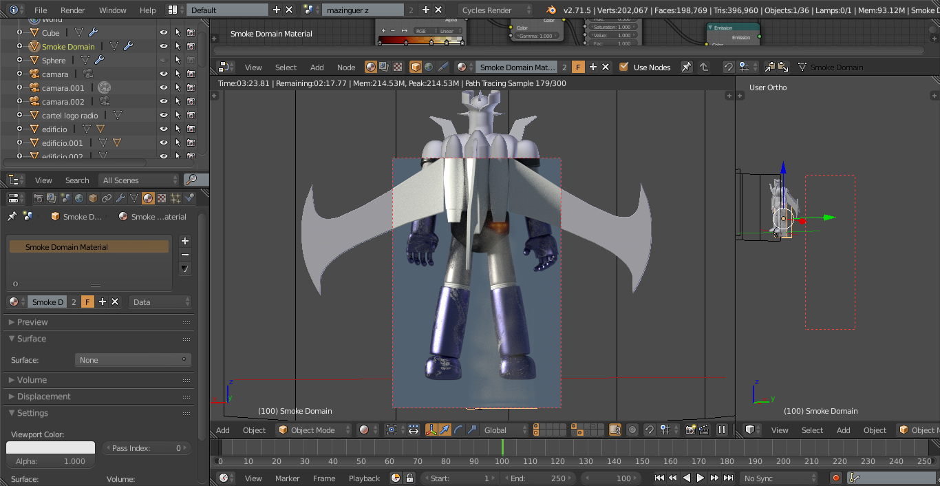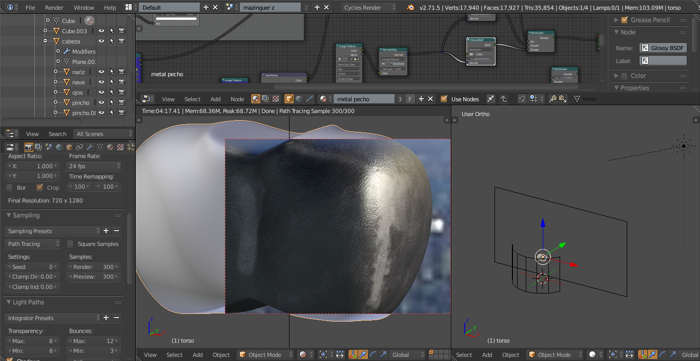 Estoy muy de acuerdo contigo en cuanto a lo del desenfoque. Yo también quería qué empezara más lejos, porque como tú bien dices se pierden detalles (y con lo que me costó hacer todo al final sólo se ve nítido el centro de la imagen). Pero es que no sé cómo controlar el alcance del desenfoque, me explico: el punto de enfoque lo puse en la tumba de la calavera, y ya el desenfoque te lo hace el programa, puedes regular el grado de desenfoque, pero no el radio de acción. Todo esto si hago el desenfoque directamente en el panel de opciones de la cámara, sin nodos. Con nodos sí sé controlar esto (con el Defocus me refiero), pero no puedo usar nodos de composición porque se me cuelga el ordenador. Si alguien sabe cómo hacer esto sin nodos.