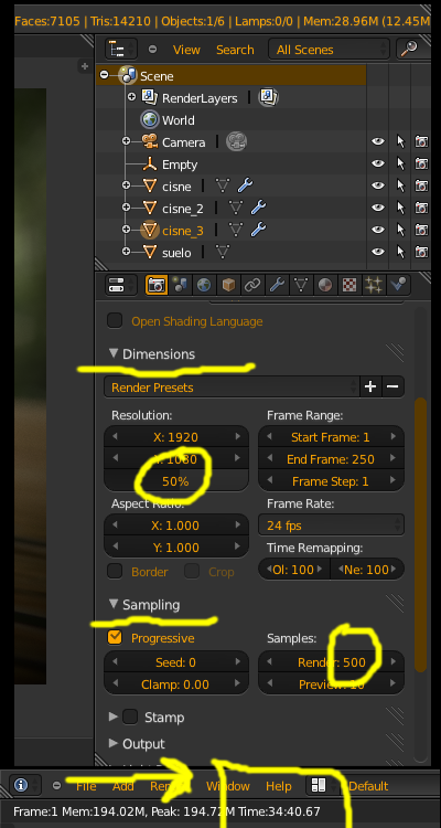 De todas formas, puedes bajar el RENDER de 500 a 100, si tu ordenador no es muy potente.