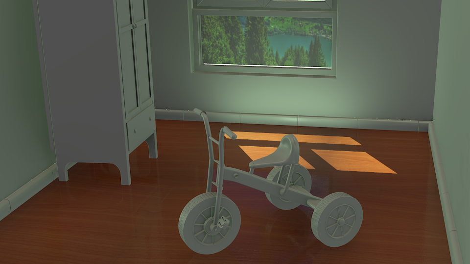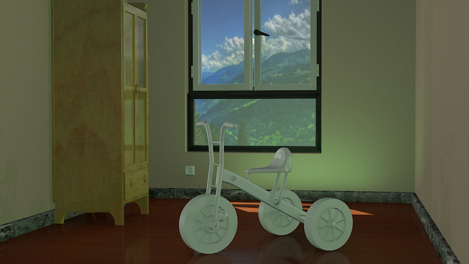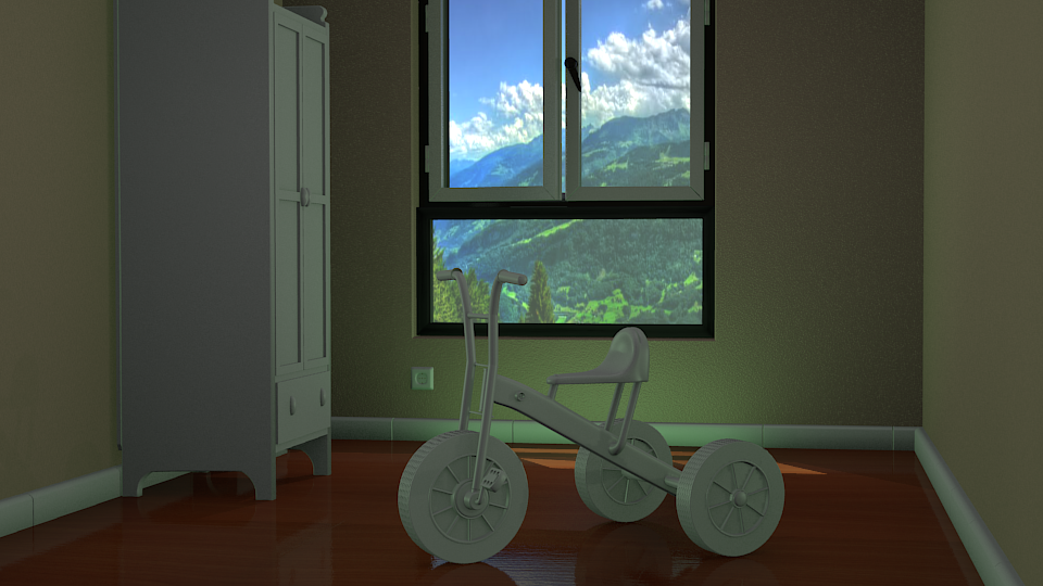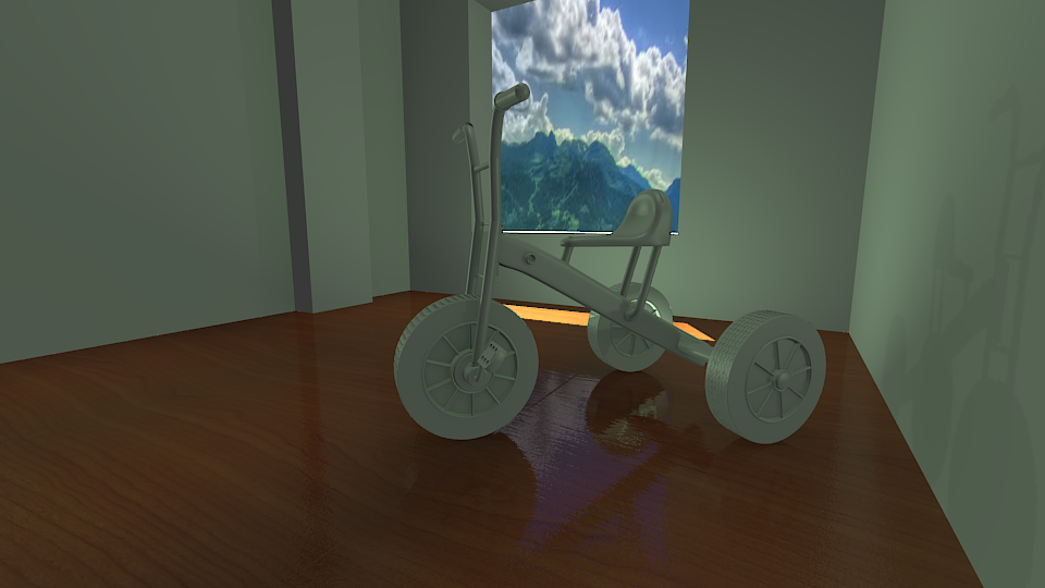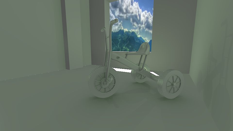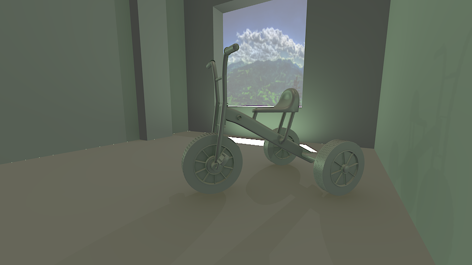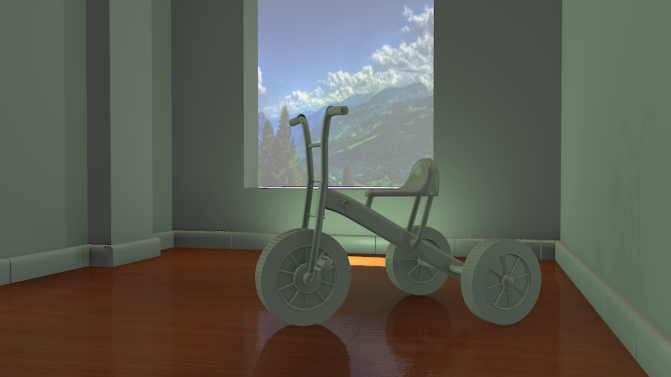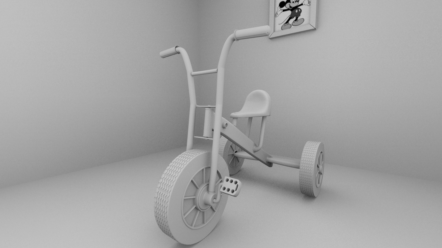 Estoy probando iluminación general antes de meterle superficies. Le he puesto una luz principal (seguramente acabara siendo un foco con sombras de buffer) y unos cuantos focos para imitar los rebotes y un par de área también. Aparte de oclusión ambiental. El triciclo ya está super acabado, no me meto más con él. Y supongo que, le pondré ventanas a la escena, mobiliario y hasta cortinas si me ánimo.
