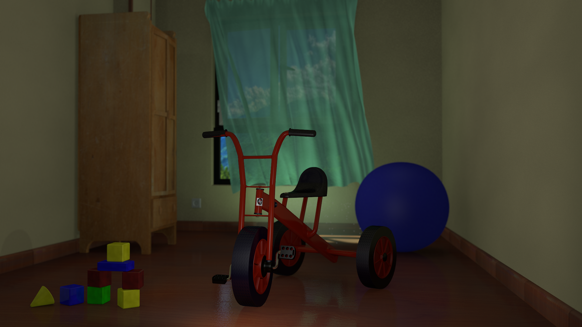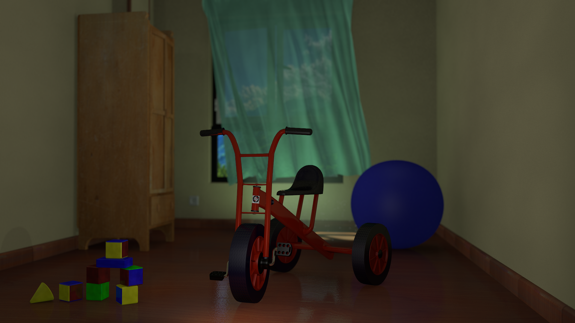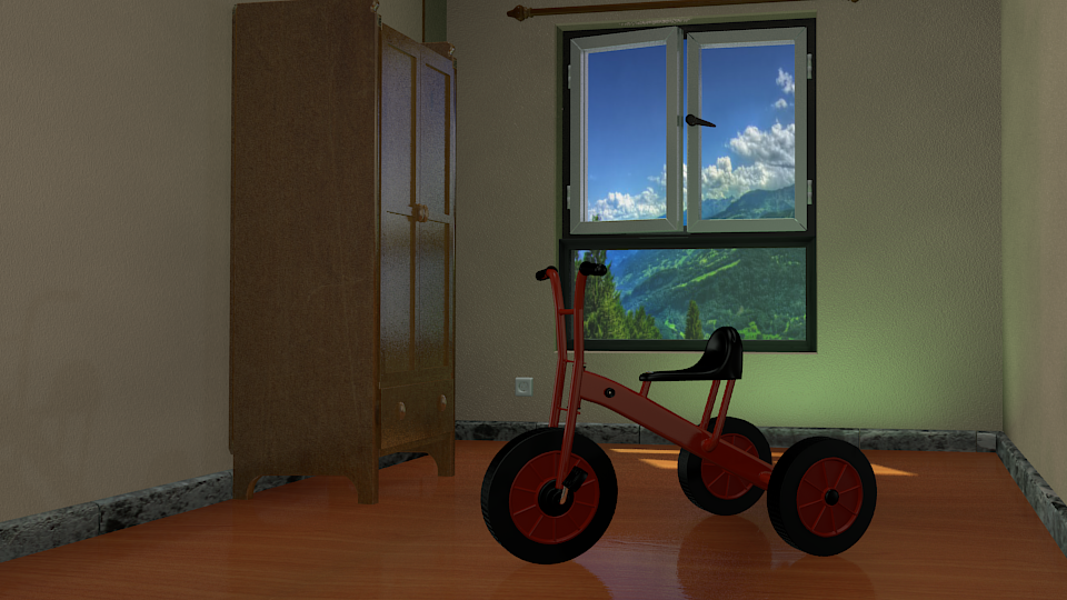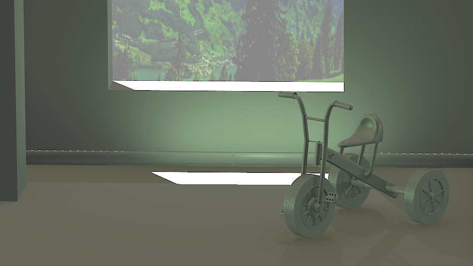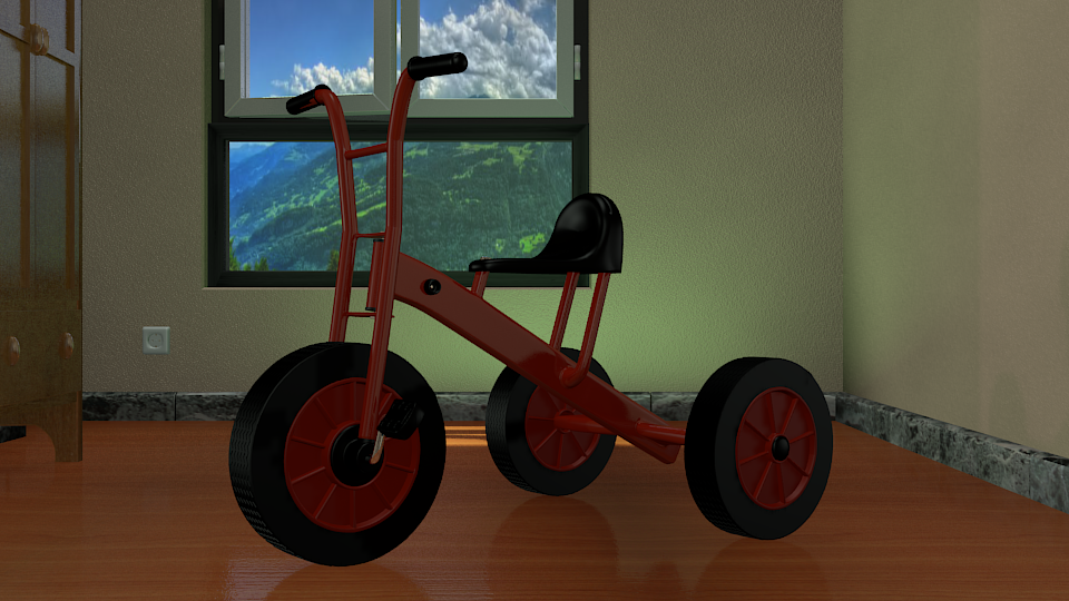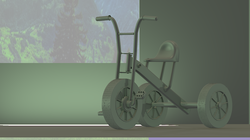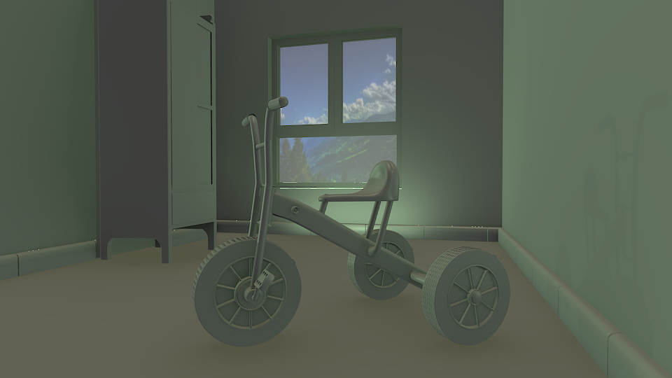 Estoy probando iluminación general antes de meterle superficies. Le he puesto una luz principal (seguramente acabara siendo un foco con sombras de buffer) y unos cuantos focos para imitar los rebotes y un par de área también. Aparte de oclusión ambiental. El triciclo ya está super acabado, no me meto más con él. Y supongo que, le pondré ventanas a la escena, mobiliario y hasta cortinas si me ánimo.
