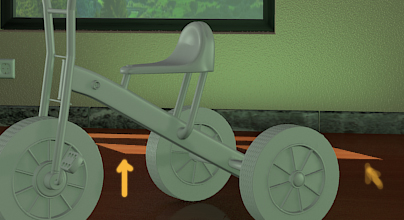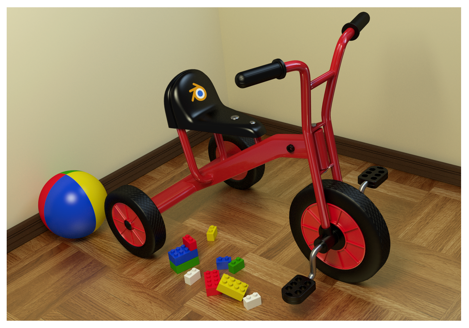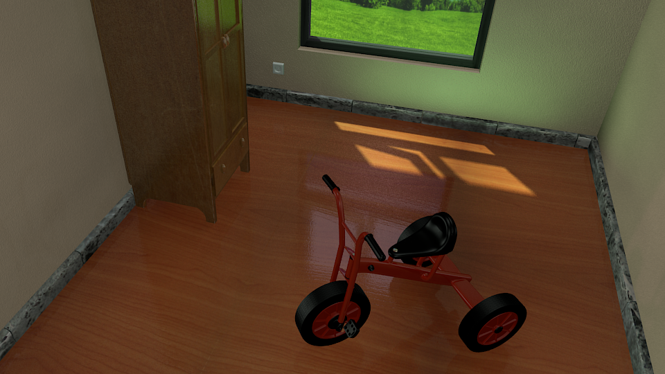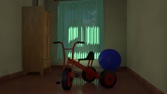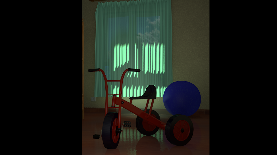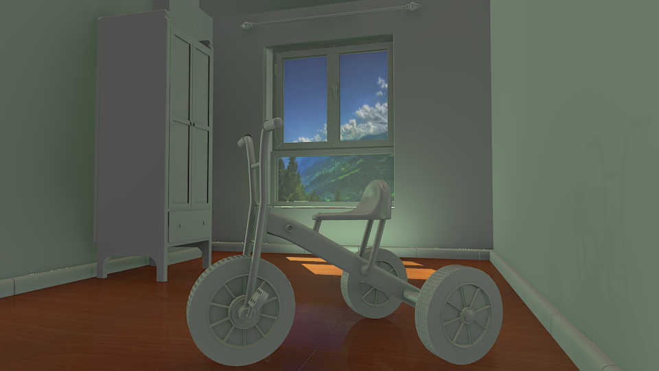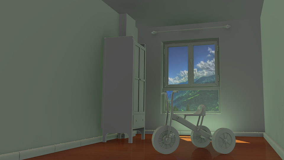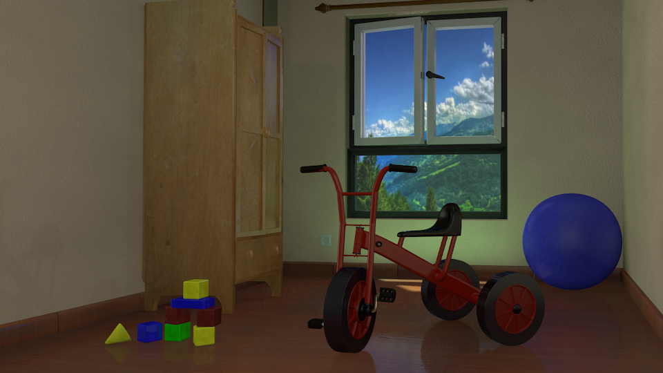 Estoy probando iluminación general antes de meterle superficies. Le he puesto una luz principal (seguramente acabara siendo un foco con sombras de buffer) y unos cuantos focos para imitar los rebotes y un par de área también. Aparte de oclusión ambiental. El triciclo ya está super acabado, no me meto más con él. Y supongo que, le pondré ventanas a la escena, mobiliario y hasta cortinas si me ánimo.
