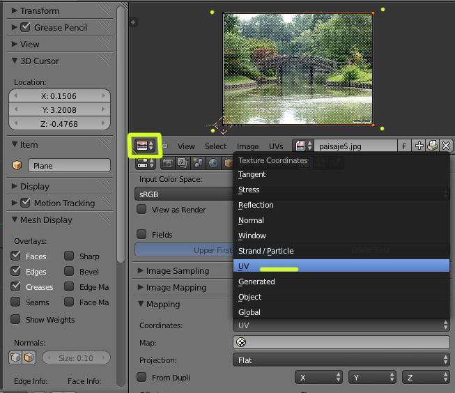 O sea, Material > Textura > Textura de imagen > pones el plano en modo edición (Edit Mode) > presionas letra U y encajas la imagen en el UV/Image Editor.