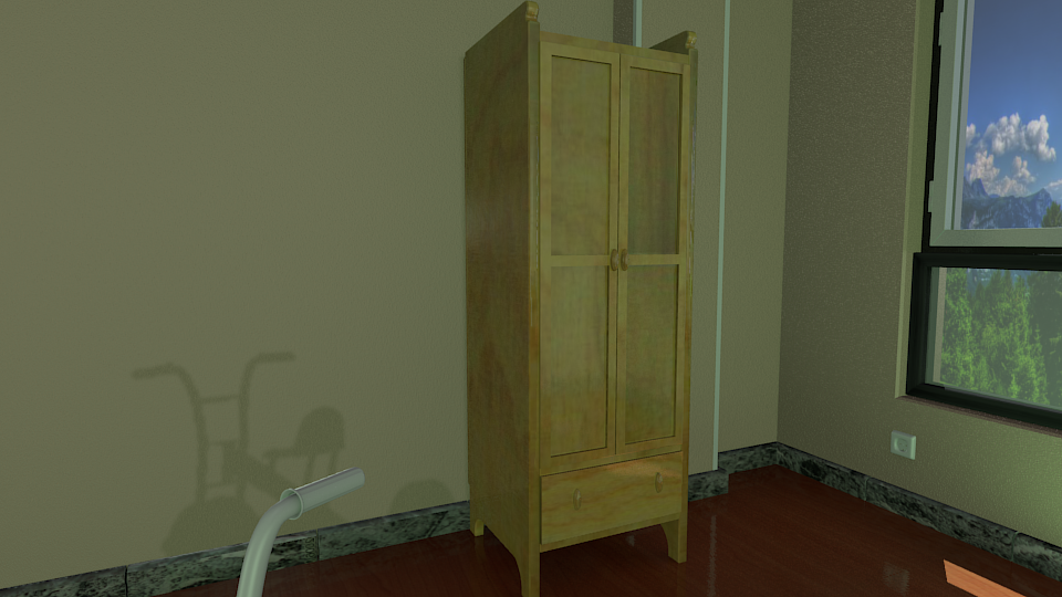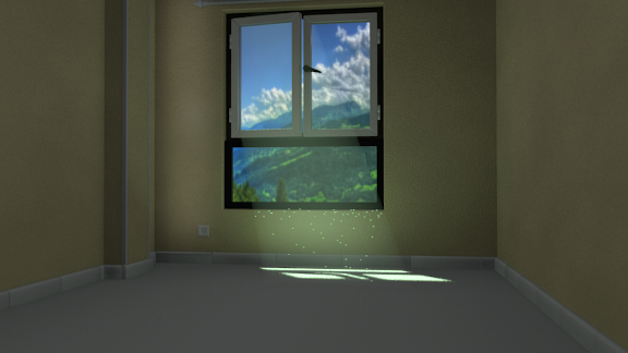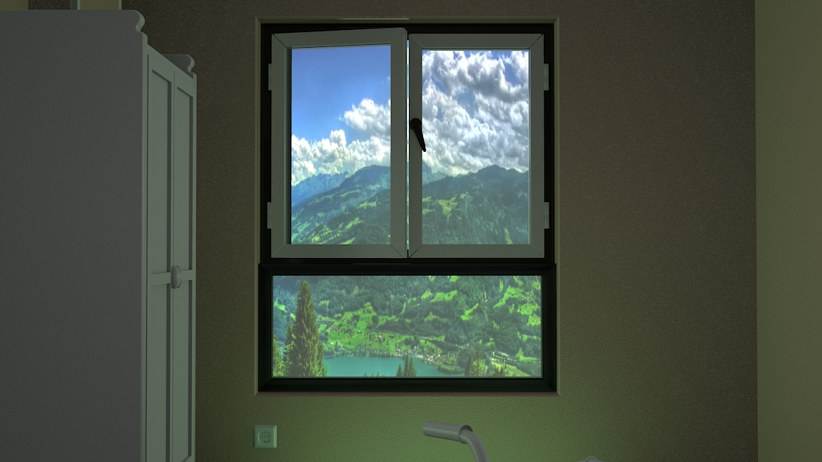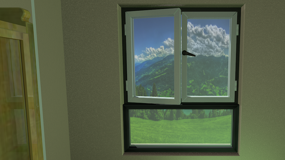 Lo que no sé cómo poner bien es la imagen de la ventana. Tiene mucha resolución, pero no tanta como la escena, y me la ensancha. Pero bueno en este punto necesito ayuda para iluminar correctamente. Saludos.