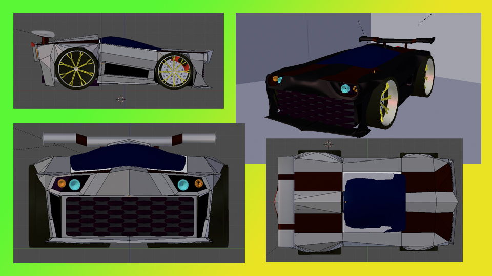 Hola amigos. Tras días de tutoriales y demás creo que voy comprendiendo un poco el Blender. Pero hay una cuestión que se me resiste, aquí os muestro unas capturas de la primera de mis paridas: el mrjuanhito race car (poca cosa). El caso es que no doy con el toque para texturizarlo y que parezca menos un dibujo. Hay capturas en crudo y otras ya con smooth, sub. Surface, y densidad aumentada. Me gustaría saber (aparte de cualquier cosa que se os ocurra, por descontado) es si no habrá alguna herramienta básica o no tan básica que le diera un aspecto más real, mate, en fin, no término de verlo. Como sea muchas gracias y ya sabéis, a criticar que, si no me entero.