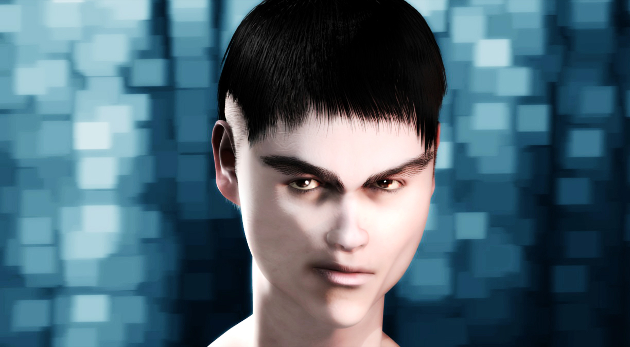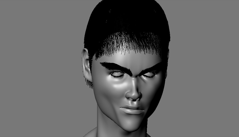 Lo que sí que cambiaría es el pelo rasurado de los lados de la cabeza, parece que tiene menos pelos, pero más gruesos que los que tendría una persona normal, yo le pondría más cantidad y menos gruesos, si es posible (a lo mejor ya lo tienes a mínimo) aunque así va a pesar mucho más.