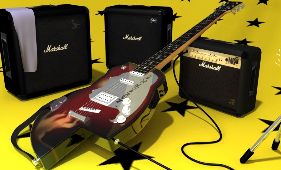 Concurso de bandas de rock en mí provincia quise contribuir con esta escena use 3dsMax y Adobe Photoshop la guitarra tiena la forma de mi provincia Mendoza.
