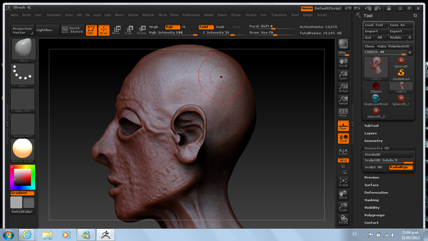ZBrush, hace unos 5 días estuve viendo las herramientas y logre hacer este modelo, la cuestión es que no sé cómo texturizar, es decir al utilizar el polypaint hay alguna opción que permita desenfocar las pincelada y de este modo lograr degradados, hay algún plugin para generar cabello realista sin la necesidad de esculpirlo, como, por ejemplo, el modificador Hair and Fur de