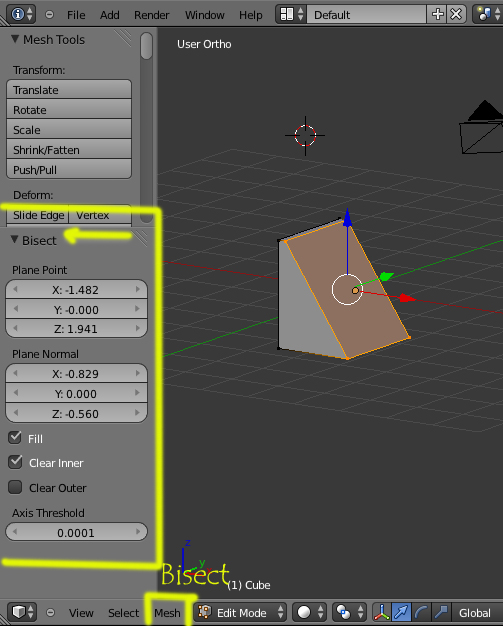CLIC Izquierdo y arrastrar ratón. Puedes entonces mover la línea como en péndulo, desde el punto que has iniciado el corte.Al hacer el Bisect, en el panel de la izquierda sale la opción Bisect como en la imagen.Por cierto, una vez seleccionada la opción de bisect en el menú, ¿a qué tecla se le da para iniciar el corte?
