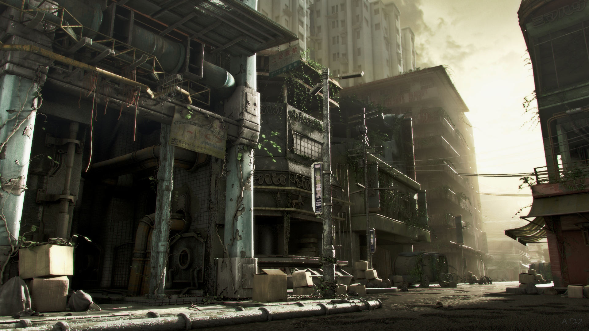 Me gusta la escena. Muy buena, el ambiente está bien logrado. Lo que te comentan sobre las cajas, con unas texturas en composición puedes hacer que se diferencien un poco más. La textura del suelo puedes mejorarla un poco, ya sea ensuciando el suelo o haciendo los Bump más marcados, pero, noté algo extraño y no sé si es a propósito o se te olvido activar algo y son las tuberías dentro del edificio se ven en facetas, no suavizadas, ¿lo hiciste a propósito? Es algo que si me extrañó.