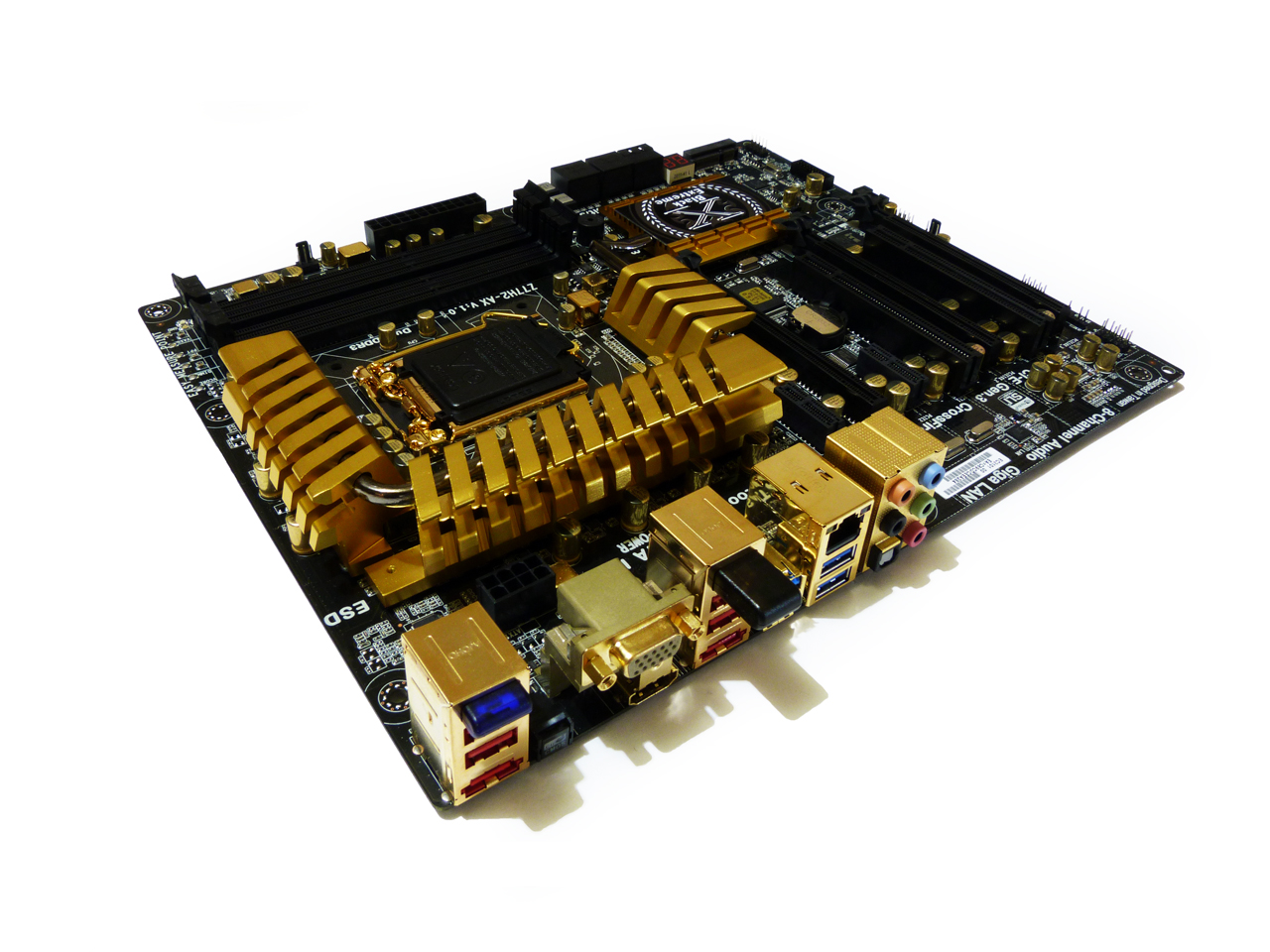 Se destaca el chapado en oro de todas las conexiones, además de que estos delicados acabados, según nos comentan, otorgan una mayor estabilidad y una mejor disipación del calor. En el otro lado se hace hincapié en las propiedades de hardware de la placa: PCI-Express 3.0, virtumvp, bluetooth, Wifi, y una infinidad de detalles que ya desgranaremos en el artículo.