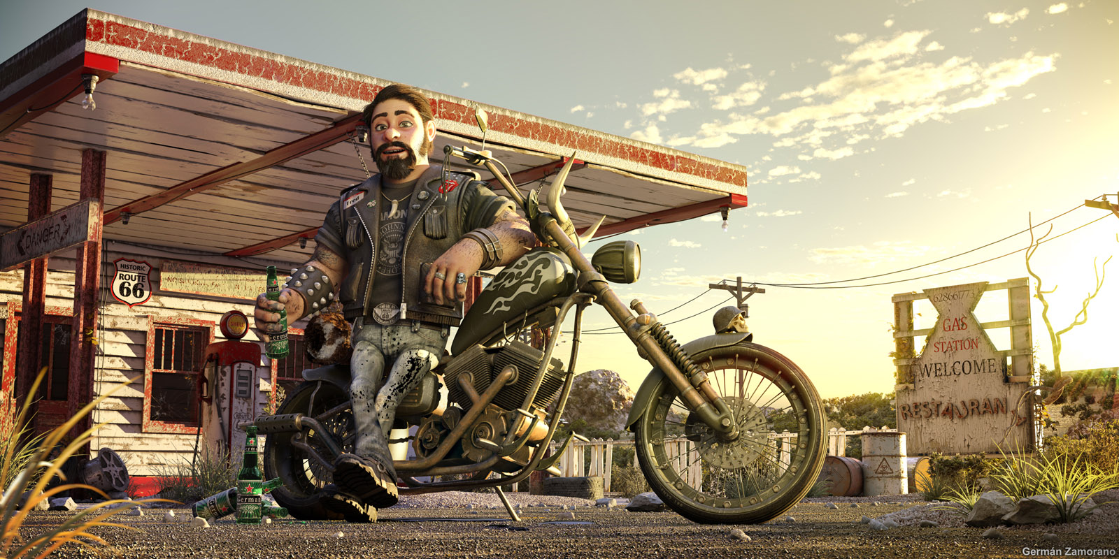 ¿De veras Alfredo? Pues yo pienso todo lo contrario. Tiene cara de buena gente aún a pesar de ser un motero macarra, así que, rompe el estereotipo de que los moteros son unos simples y brutos borrachos salvajes. Éste personaje no pierde ni pizca de esas características (incluso en la mirada se puede detectar cierto grado de embriaguez) y a pesar de eso dan ganas de hacerse amigo suyo y yo creo que eso es lo que lo hace interesante y le da una personalidad especial.