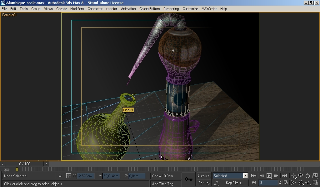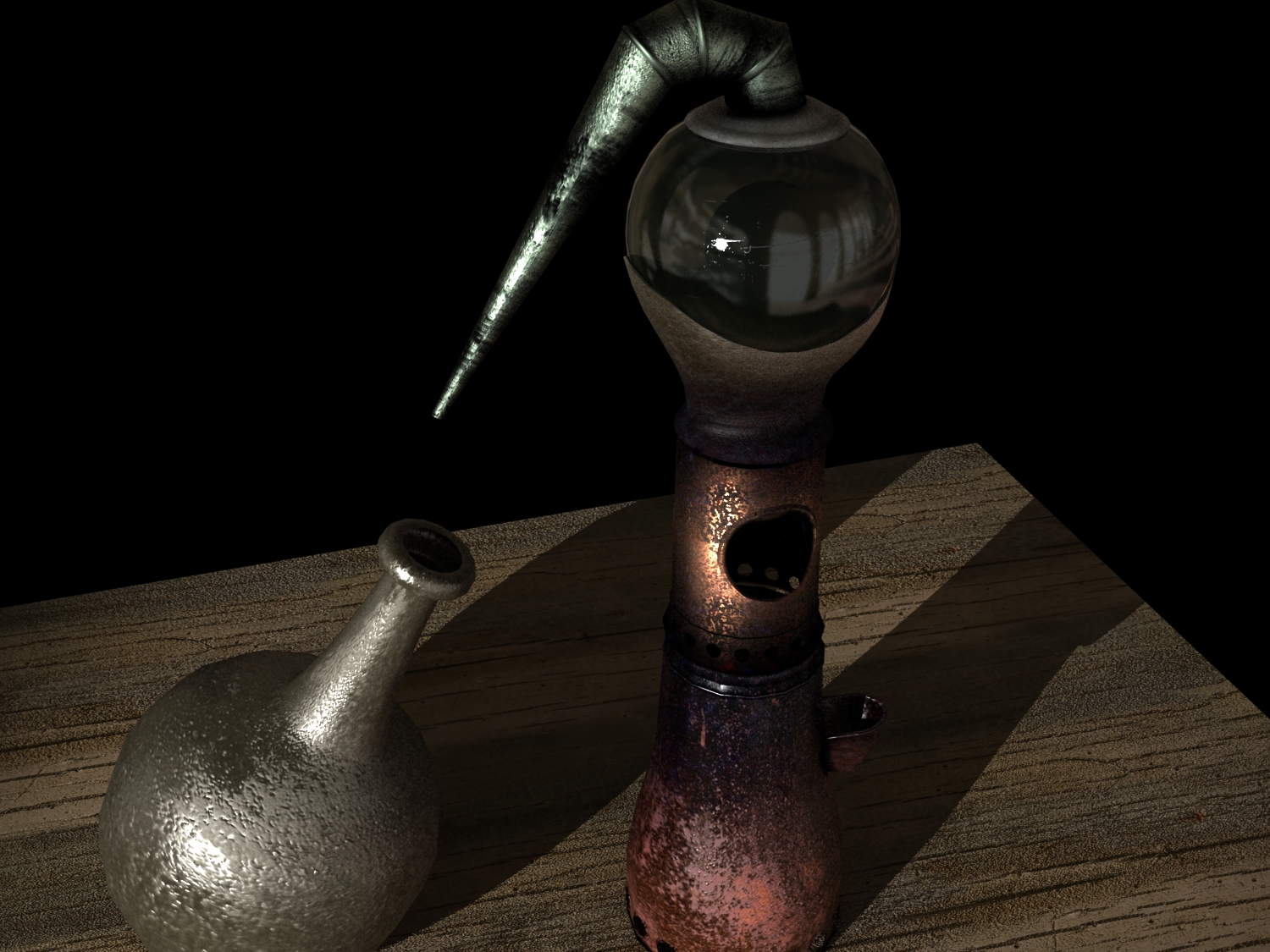 Objeto renderizado con Vray, se usó Vray Dirt para la suciedad y el hollín. Los hoyos y rebordes en el objeto de cobre son mapeados (transparencias en el canal opacity y Bump para el reborde).