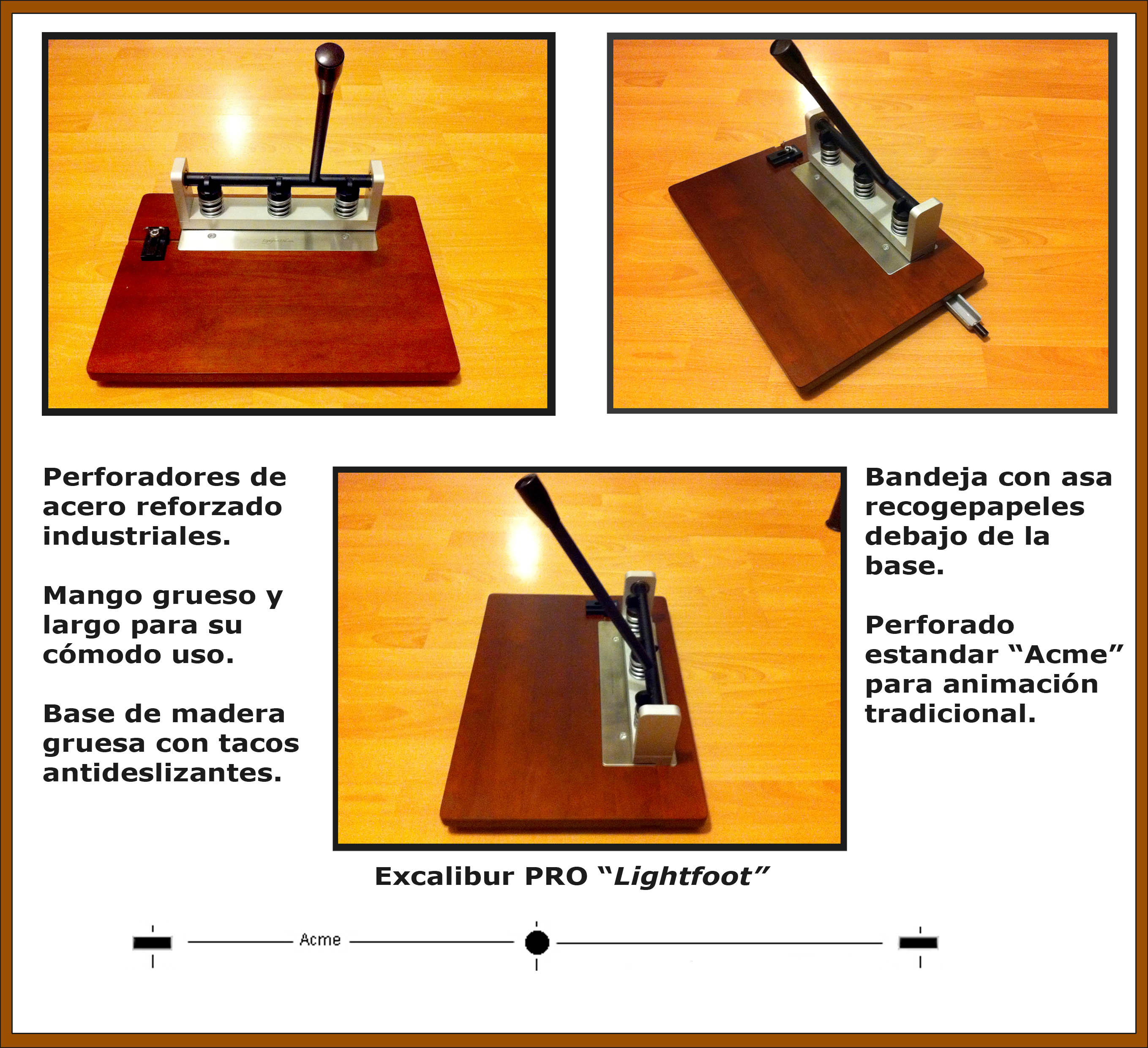 La base es de madera de 2cm de grueso para dar consistencia de un color cahoba y barnizado, tiene unos tacos de goma para un agarre perfecto, contiene un tope ajustable y extraíble para el perforado estándar de animación, 12f y 10f.