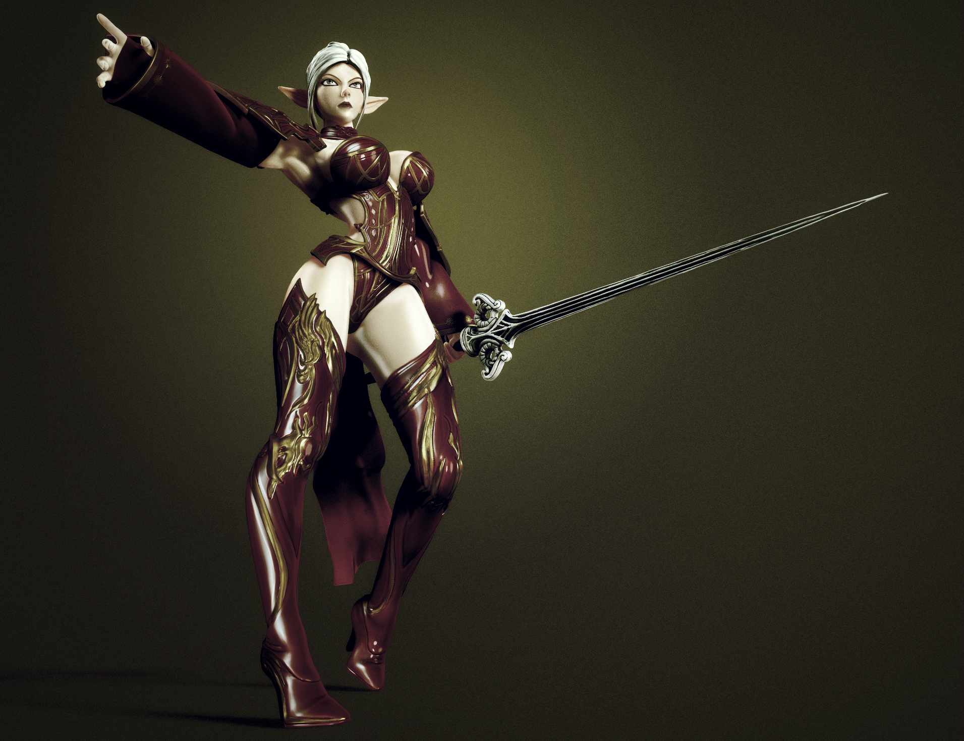 La elfa oscura sería exactamente como la has concebido, pues es lo opuesto, no atañe a la feminidad sino a la manera que los hombres tienen de trabajo su libido masculina sobre los fetiches femeninos. La elfa oscura maneja las bajas pasiones del varón y lo domina perversamente, de hecho, ella postura un elemento falico enorme que es esa espada, la cual surge del cuerpo mismo, a la altura de la pelvis.