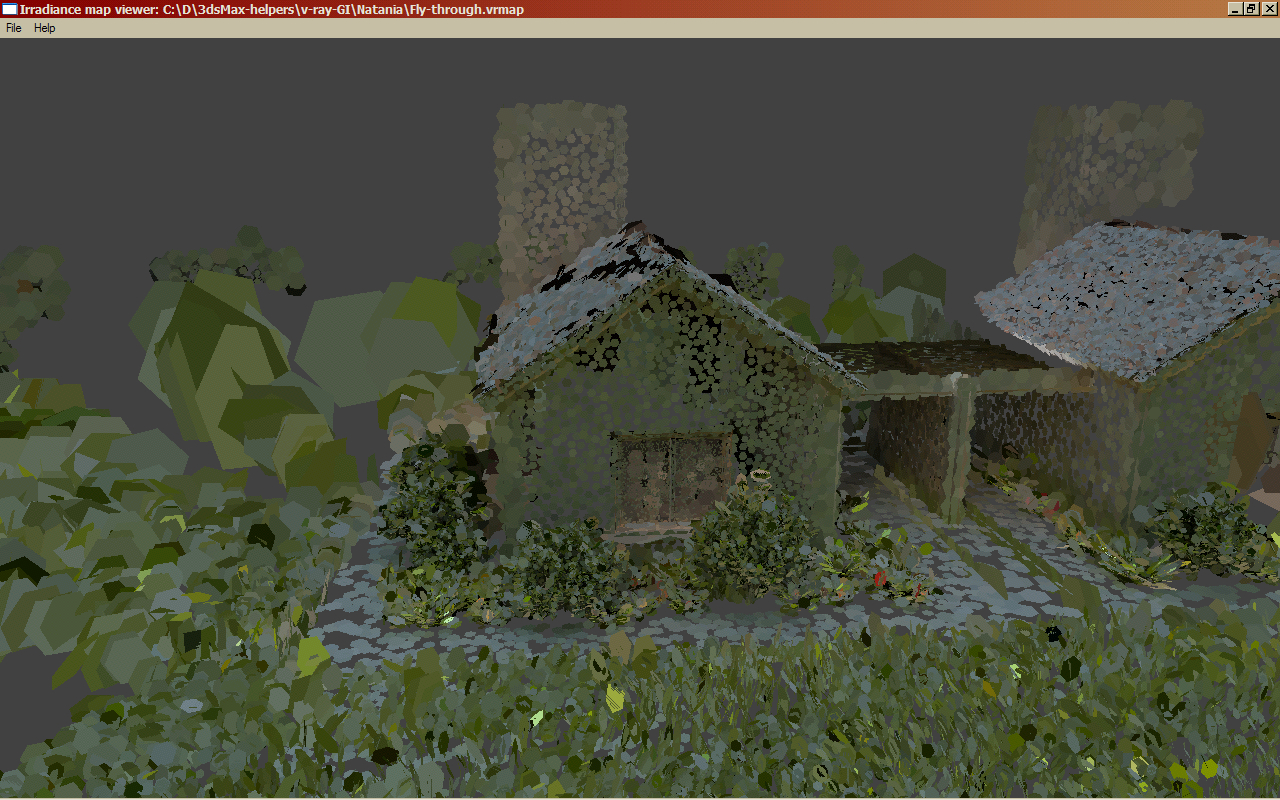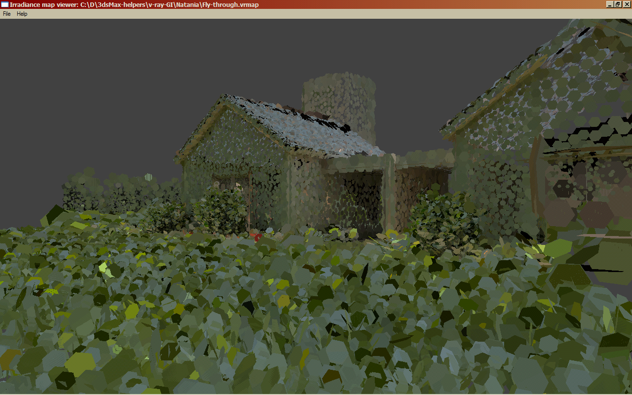 Detalle de Vray, la diferencia de tamaño los globillum (como puede apreciarse en estas imágenes de irradiance) denota que Vray genera más resolución de irradiance donde es necesario, y en áreas menos importantes los globillum son enormes. Esto es lo que hace tan rápido a Vray ante otros tracers.