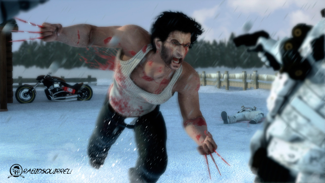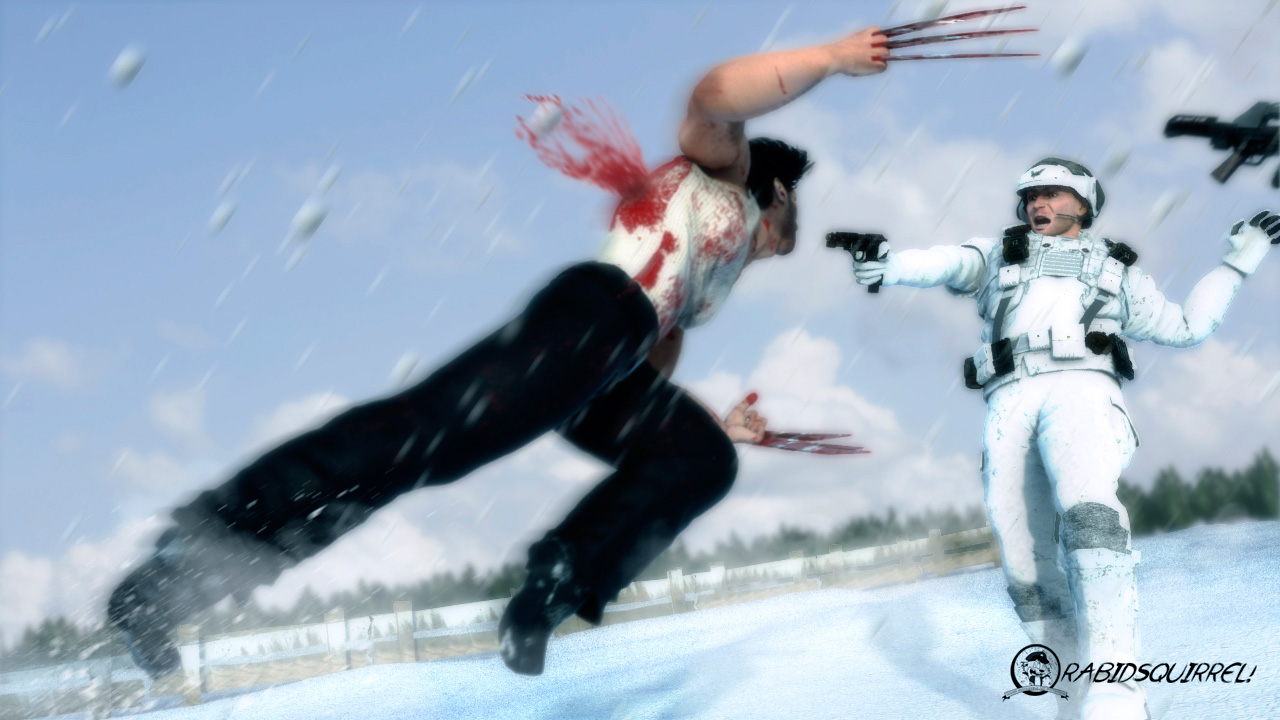 Logan atacado en su cabaña en Canadá, ya acabó con uno de los comandos, va por el segundo y el tercero esta disparando, aunque no sirve de mucho render con Mental Ray u postproducción con After Effects.