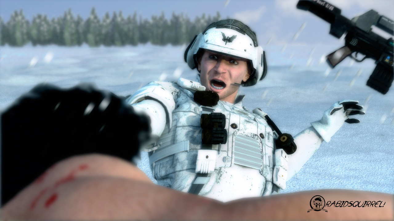 Otra cosa que le falta un poco de detalle, es al suelo, dónde está el soldado medio enterrado 4 imagen, o no usas ese tiro de cámara o si la vas a poner ahí, tendrías que haber hundido un poco la nieve haciendo la silueta del soldado.