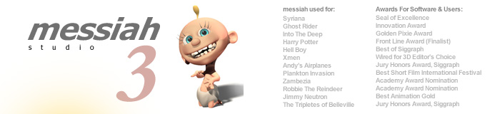 Aún no tengo una máquina en condiciones para testear este software, que acertadamente ofrece una versión de demostración, pero mi curiosidad es grande, se ha tocado el tema con frecuencia en los foros de Animation Master en CGtalk y el Messiah parece muy respetado por los más expertos. Eggington, reconocida productora que trabaja entre otros con Animation Master utiliza también el Messiah: animate. Pues eso, ahí lo dejo. Un saludo de Shazam.