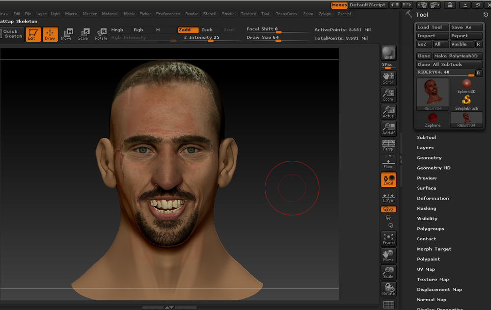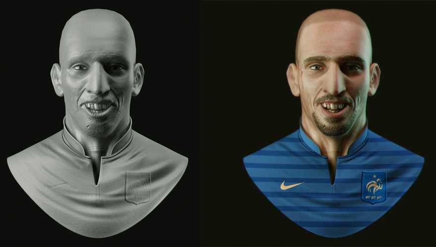 Quería compartir este trabajo, en el que estaba ocupando el tiempo, es un busto de Frank Ribery, modelado en 3dsmax, esculpido en ZBrush y renderizado con Vray, quería probar mejor el material de piel y algo en los ojos que siempre me queda mal. Espero les guste y espero haberlo subido bien saludos. Si quieren pueden pasarse por mi portafolios hay más trabajos www.cokecoco.com.