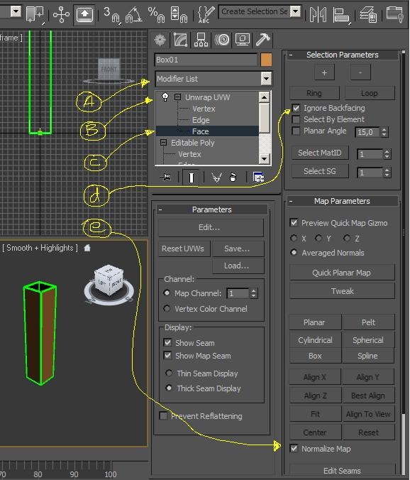 4.- En: (a)panel modificador, de la lista selecciona (b)unwrap y (c)clic en face, (d) desmarcar ignore backfacing y (e) desmarcar normalize map.