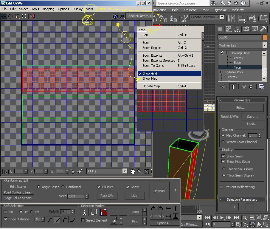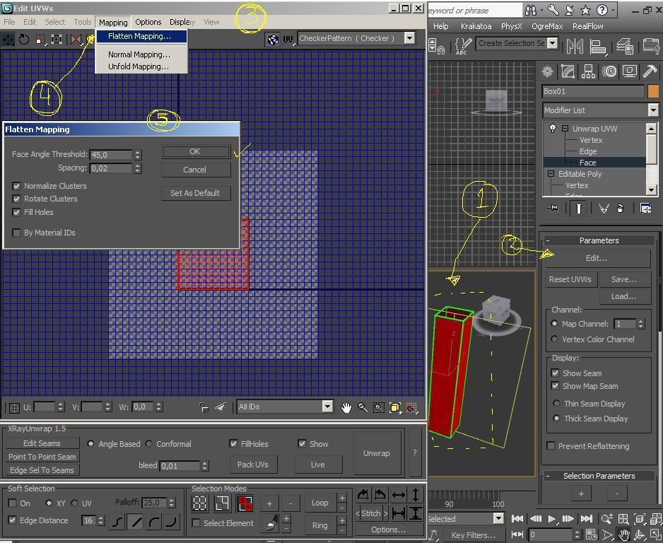 5.-(1)seleccionar todos los polígonos(en vista perspectiva), (2)presionar botón edit, (3)en panel edit UVWS presionar (4) mapping y seleccionar Flatten mapping y presionar ok.