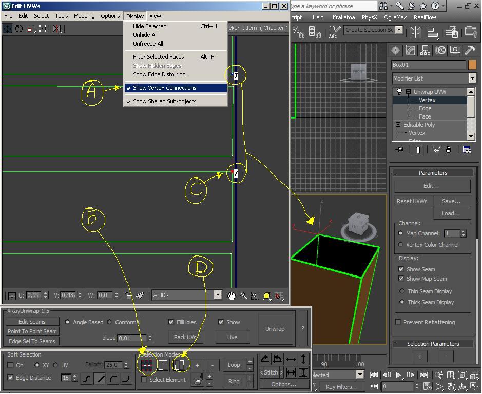 7.-(a) en menú display marcar show vertex connections, (b) luego seleccionar más abajo el primer recuadro vertex, (c) seleccionamos cualquier vértice (quedará en rojo y automáticamente se seleccionara su par con azul, lo hago para ver la posición de los polígonos).(d) debemos girar los 4 Faces hacia la izquierda, seleccionamos face.