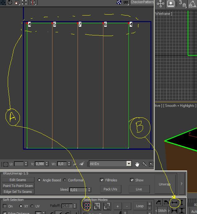 8.-(a) se pincha en angle Snap o en el teclado se presiona la letra a, (b) en edit UVWS se selecciona rotar o se presiona la letra e. Se debe rotar hasta que quede verticalmente.