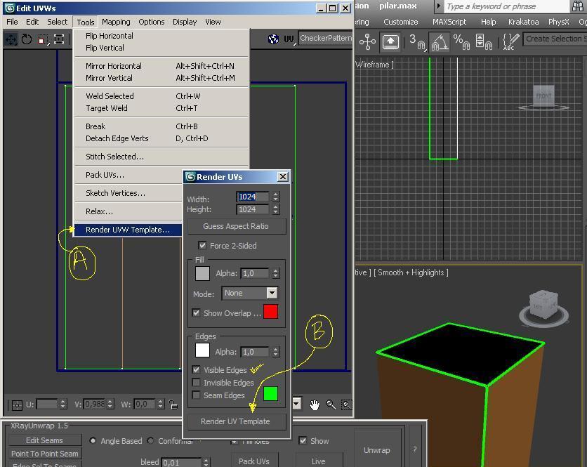 13.- (a) ahora ir a tools>render UVW template, (b) seleccionar tamaño de salida, si es para algo grande cómo en este caso le colocamos 1024*1024, para que al render la imagen no salga tan pixelada, sobre todo en tomas cercanas de cámara.