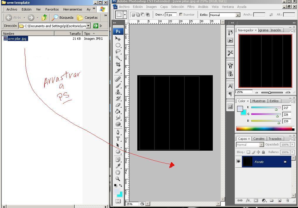 15.- Arrastrar la imagen (*.jpg) creada UVW a Adobe Photoshop.(será nuestra guía de coordenadas y límites).