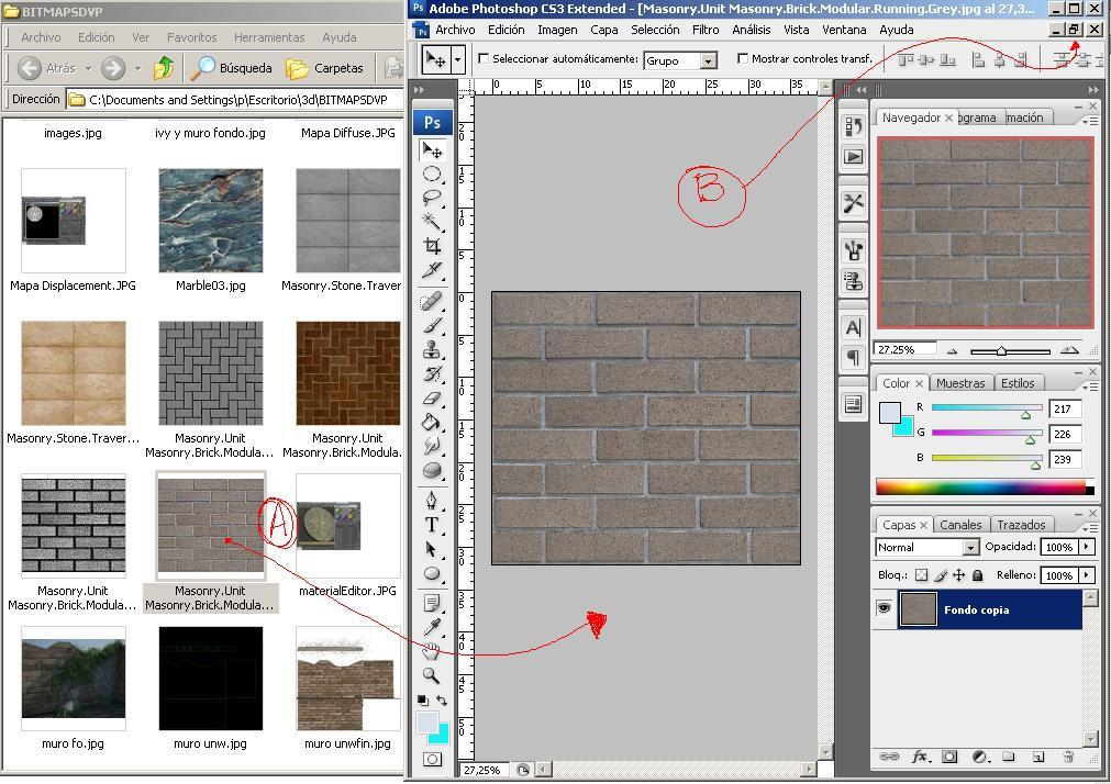 16.- (a)arrastrar imagen brik a Adobe Photoshop, por ejemplo, (este ira en materiales en canal Diffuse más tarde), (b)presionar minimizar para ver el UVW anterior.