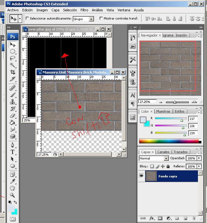 17.- Con shift presionado arrastrar imagen brik a imagen UVW, quedará ajustado a su tamaño de documento, cerrar imagen brick, ya que ha sido copiada, no guardar cambios.