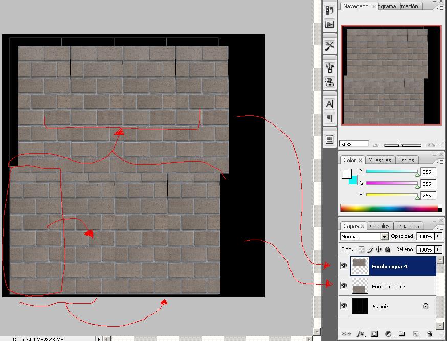 21.- Ahora abro imagen (*.jpg) recién creada para que de esta generar los relieves (mapa displace o Bump), ajusto a blanco lo que será afectado como un nivel positivo y a negro para lo que no quiero que tenga relieve, en este caso el cemento o pegamento y bordes.