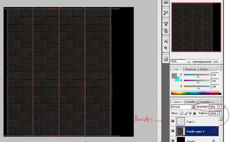 19.- Crear otra capa para añadir bordes, que se supone es el pegamento o cemento de nuestras placas aspecto de ladrillo. Con el lápiz las cree (manteniendo tecla shift para que salgan rectas) y luego aplique un filtro de grietas.