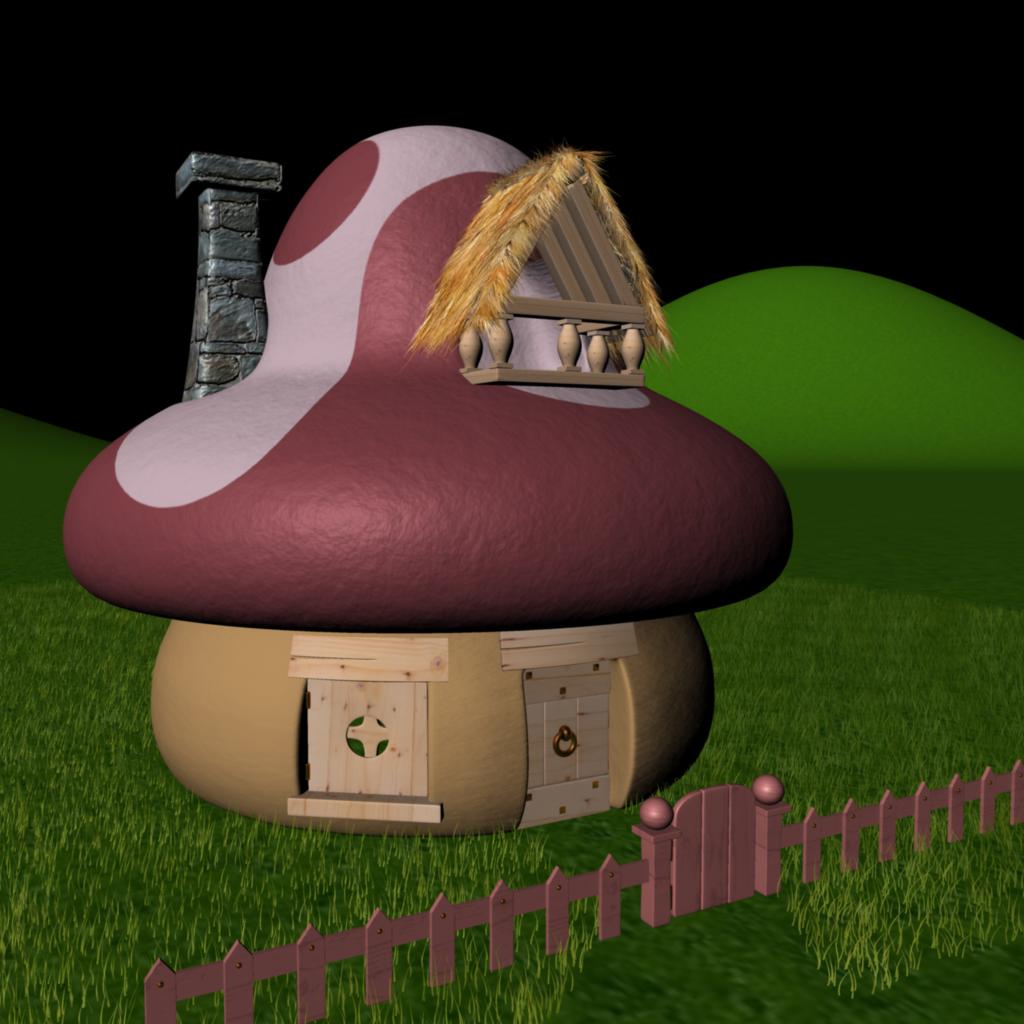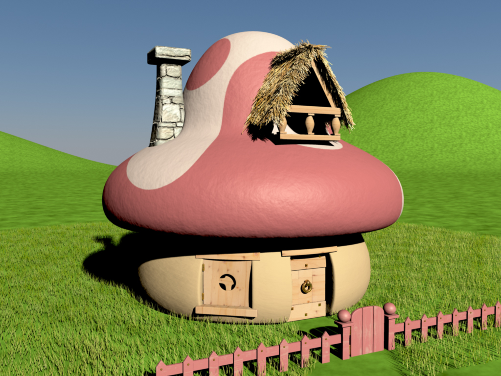 Y por último las texturas tienes que probar con los demás canales que tiene el material como el Bump, por ejemplo, en la piedra de la chimenea y en los especulares de los demás materiales ya que la seta tiene demasiado especular y la valla se ve demasiado brillante, aunque hayas creado césped debes de texturizar el monte y la hierba para darle más realismo o crear el efecto de imagen que estés buscando. Un saludo y suerte con los avances.