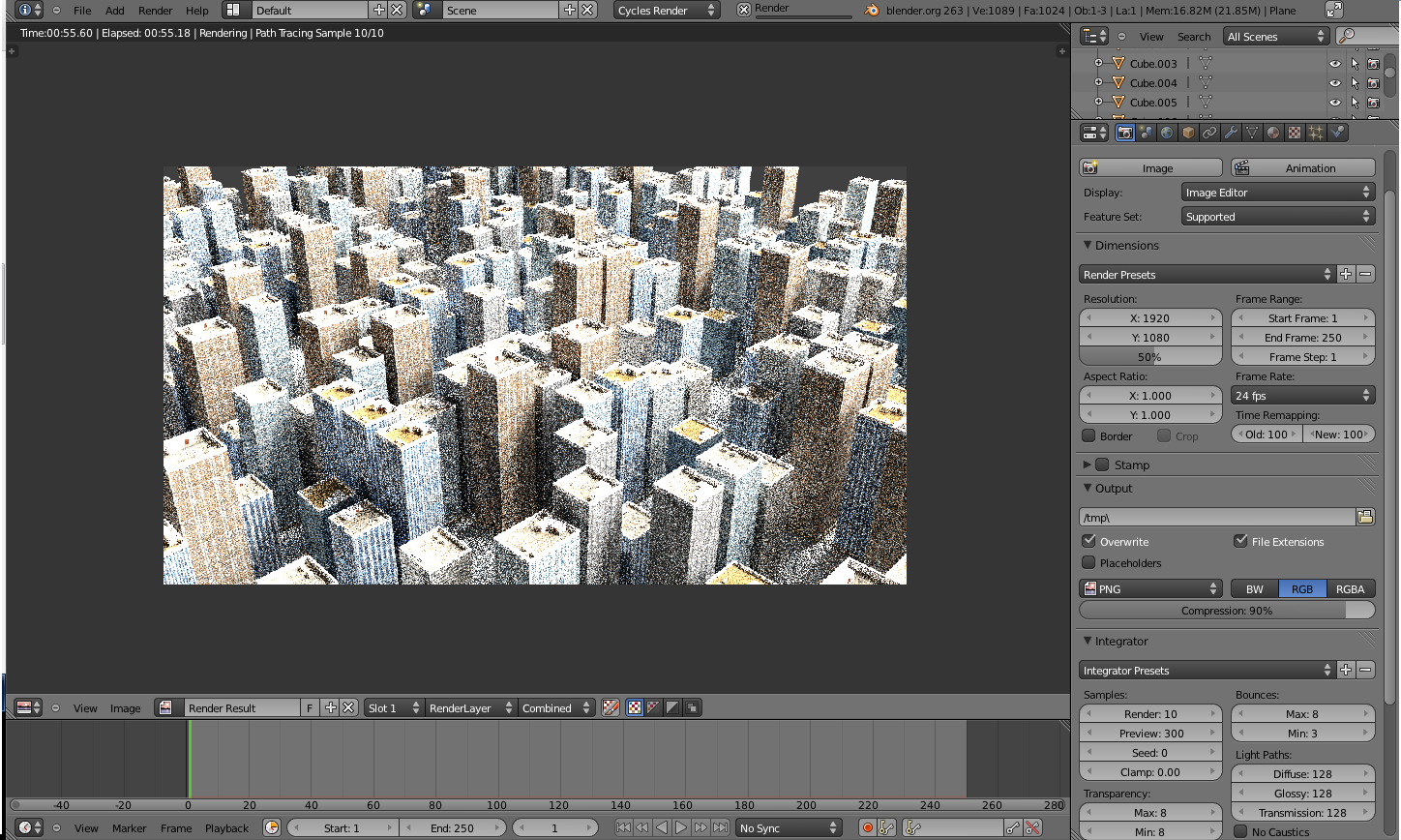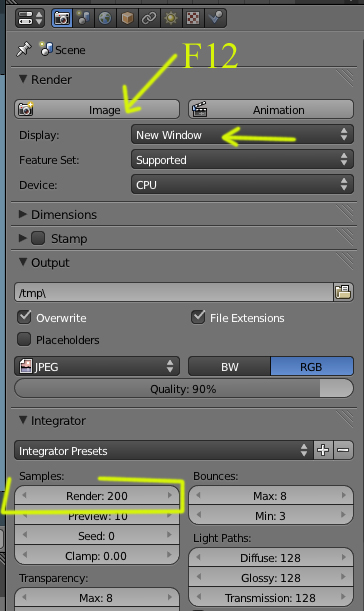 Y la que yo te comento es el render final, o sea, que cuando ya sabes cuantas pasadas necesitas, se colocan en la opción render y presionas image o f12 y para estar seguro que lo haces bien, pones de salida new image. Esto hará que se abra una nueva ventana y empezara el render y en la barra superior podrás ir viendo como suben los valores, y el valor máximo que tienes puesto, cuando ya termine, o en el momento que tú quieres (aunque no haya terminado) puedes desde la barra inferior presionar image > save as image y guardarla donde quieras.