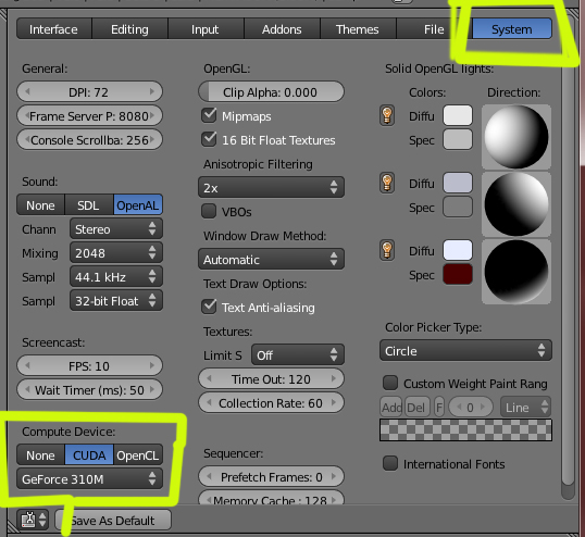Luego abres una ventana de user preferencias en Blender y miras en system a ver si te ha detectado la tarjeta.