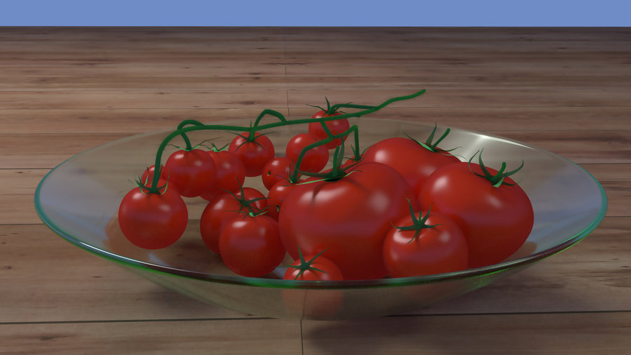Buen trabajo. El modelado está muy limpio, en cuanto a los materiales podría agregar algo de transparencia en el Shader para simular el s del tomate. Con el nodo light Path-> ray length, y así controlar la absorción de la luz. Saludos cordiales.Una escena sencilla con unos tomates cherry y normales, para practicar con los materiales en Cycles. No estoy muy contento con las ramas, pero por ahora me doy por satisfecho.
